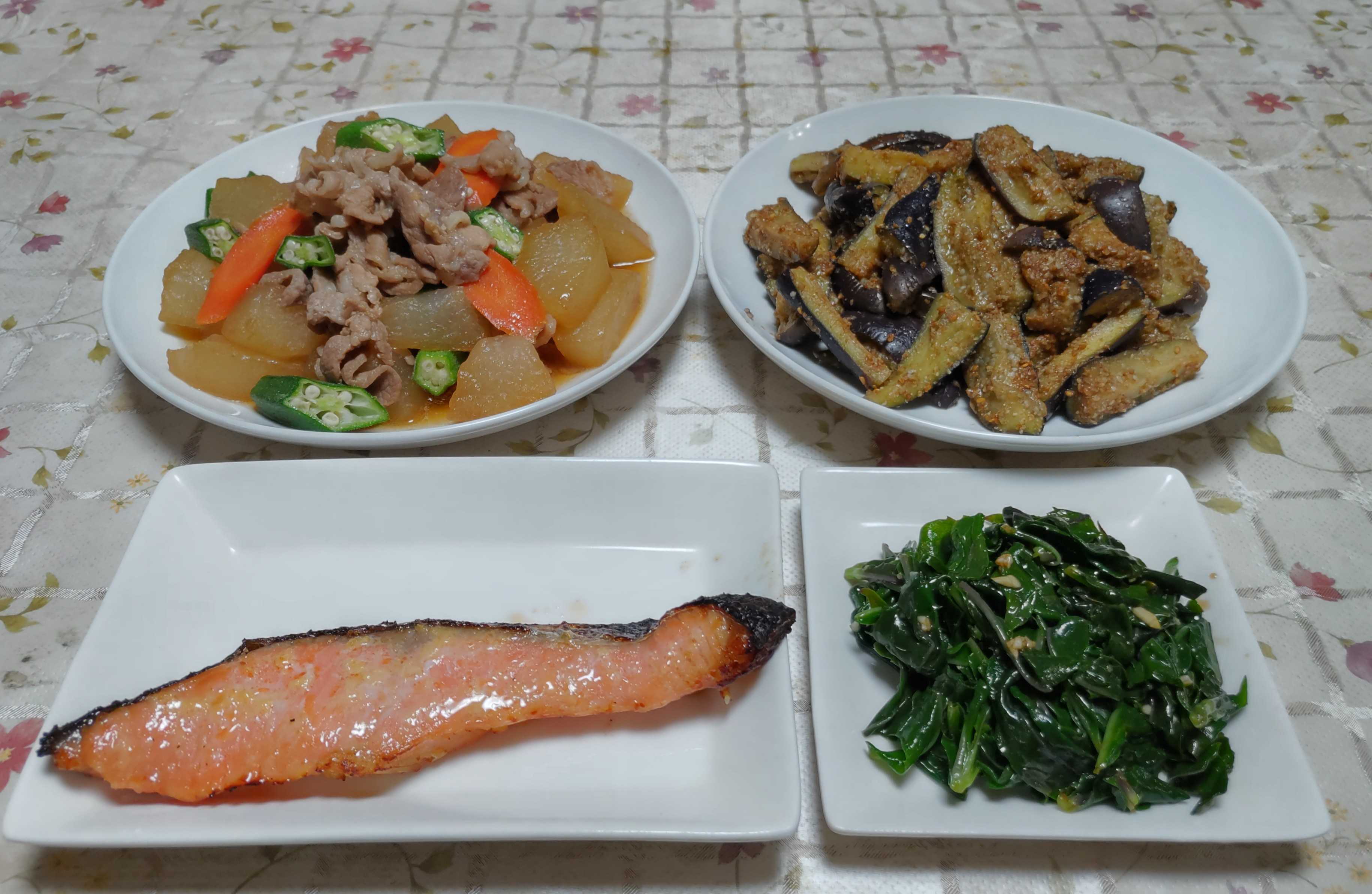 今日のごはん今日のごはんは鮭の西京漬け冬瓜の煮物ナスの胡麻和え金時草のナムル鮭の西京漬けは 鮭の西京漬けをグリルで焼きました。冬瓜の煮物は 冬瓜を豚肉と人参と一緒に煮て彩りに茹でたオクラを加えました。ナスの胡麻和えは ナスをレンジで蒸して たっぷりのすりゴマ・砂糖・醤油で和えました。金時草のナムルは 金時草の葉をゆでて醤油・ごま油・すりおろしたニンニクで和えました。冬瓜はとても大きいので一つの冬瓜で何度も調理して食べられます。今回は豚肉と合わせて砂糖と醤油でこってり味にして食べました。飽きない様に色々な味付けの煮物にしたり汁物にしたりして食べています。野菜くずを捨てる場所から今年も冬瓜が芽を出してたくさんの冬瓜が生っています。4~5年前にパイナップルの上部の葉の部分を植木鉢に植えました。冬は室内に取り込んで育てて年々大きく成長しました。数日か前に葉っぱの中央から蕾のようなものがあるのを見つけました。蕾のようなものは こんな感じネットで調べるとやっぱり蕾のようです。花が咲いてパイナップルができると思うと嬉しくなります。今日はこんな感じで少しずつ伸びてきています。毎日の観察が楽しみです。4年生の孫が保育園に通っていた頃にお散歩で見つけてきたおオシロイバナの種何個かもらって庭に蒔いたら毎年きれいに咲いてくれます。今はタネを蒔かなくても零れ種で何か所も芽を出して咲いています。