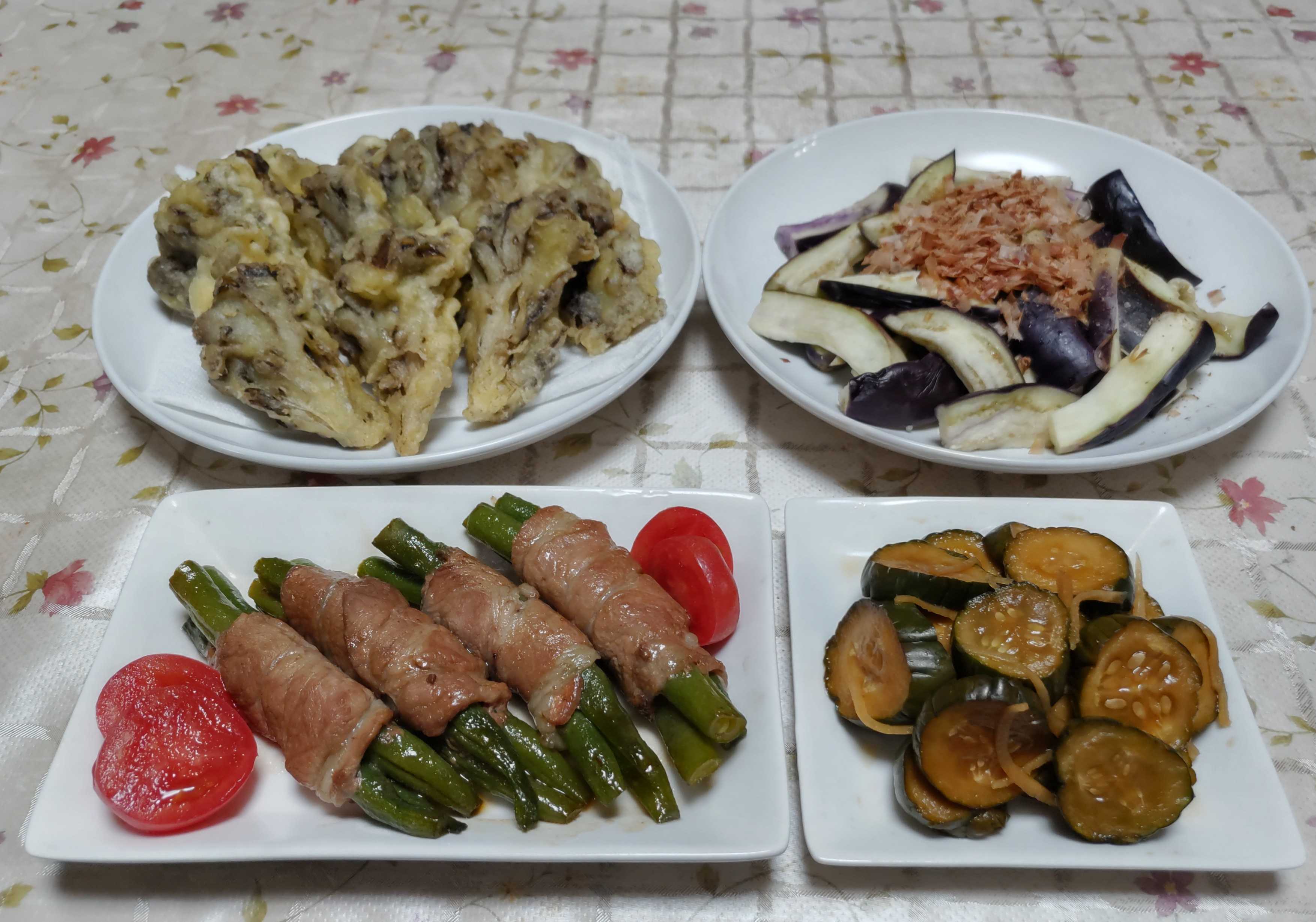 今日のごはん今日のごはんはインゲンの肉巻き舞茸の天ぷらナスのお浸しQちゃん漬け風漬物インゲンの肉巻きは 茹でたインゲンに豚肉を巻いてフライパンで焼いて甘辛く味付けました。舞茸の天ぷらは 群馬で買ってきた100日舞茸を天ぷらにしました。多めに揚げて翌日は旅先で買ってきた水沢うどんと一緒に食べました。ナスのお浸しは 電子レンジで蒸したナスに鰹節を乗せてお醤油を少しかけて食べました。Qちゃん漬け風漬物は たくさん収穫できたキュウリでQちゃん漬け風に漬けておいた作り置きの漬物です。時々出して食べています。次に作ったら小分けして冷凍保存しておきます。今年は白ナスの苗をもらったので育てています。まだ株は小さいのに立派な白ナスが付いていました。そろそろ収穫しようと思っています。家から少し離れた所にある畑に植えてある栗の木に可愛いイガができていました。花が終わると根元にトゲトゲの小さいイガができていました。今年も義妹から立派なメロンをいただきました。タカミメロンのレッドとグリーンそろそろ同封されていたメモの食べ頃になったので食べようと思います。家の庭のノウゼンカズラの花がたくさん咲きました。今年はいつもより花数が多いように思います。3カ所で同じように咲いています。