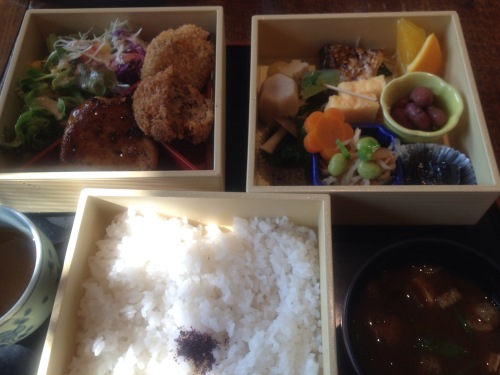 のんのんママですこんばんは昨日は 熱田神宮参拝のあとこんなランチに舌鼓を打ちました、大好きなお店 ジュノスの重(かさね) です 一の重が こまごましたおせちのような 料理の数々二の重が サラダとコロッケ ミンチカツ 豆腐ハンバーグ三の重が ご飯ですそのほか お味噌汁に お漬物。毎回 美味しく頂きます。