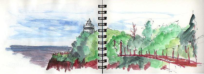 場所は同じ城ヶ崎 灯台と吊橋同じようなアングルでスケッチする人達が数名いた私も加わり 小さなスッケチブックを両開き 10分とかけずに完成(少し雑な色付けでした)