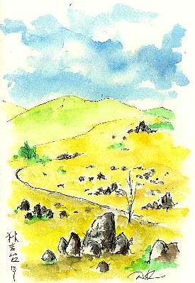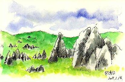 この絵は案内に載っている写真から起こしたものです広大なカルスト台地に岩が露出している景色は昔から知っていました教科書でも習ったし観光地としても有名な場所ですでも これだけ沢山の岩が集まって見れる場所は少なくて探すのに苦労しましたしかし さすがパンフレットです 「いい場所」に見えますということで期待は高まっての現地入りでしたお気に召しましたら人気blog投票をクリックして下さい