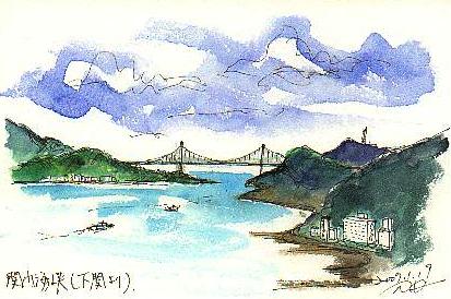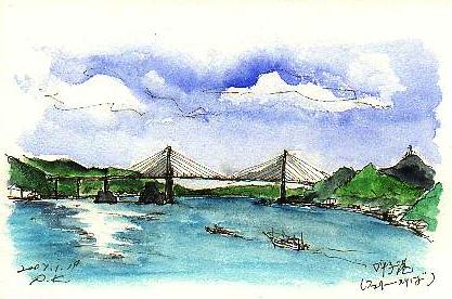 壱岐の島へ渡るのは呼子港からフェリーで1時間半ぐらいの行程このスケッチは出航まえのデッキから行く手の呼子大橋を描く朝日が眩しく水面を照らしているところを描きたかったが・・・・・お気に召しましたら人気blog投票をクリックして下さい