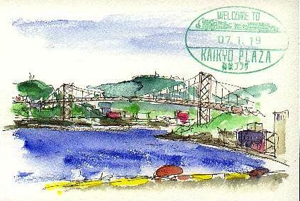 下関から海底トンネルを通って門司に出るそこはレトロな建物が残り集まっている海峡プラザ「レトロ地区」波止場から昨日と同じ関門橋を見ての走り描く港らしく商社の建物が用途こそレストランなどに変わっているものもあるがしっかりと保存されているお気に召しましたら人気blog投票をクリックして下さい 尚 以前(写真から描いた)門司港駅をUPしたことがありますがここで見れます