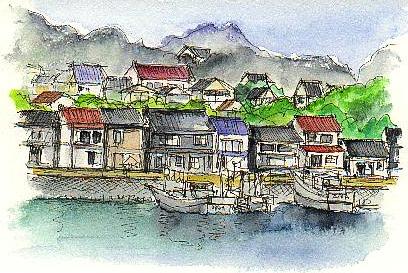 呼子から船で壱岐島の郷の浦港に着くここ壱岐は長崎県である高速船が長崎からも来るが距離的には佐賀にある呼子が一番近い波止場から肩を寄せ合うように並ぶ家並みを描くお気に召しましたら人気blog投票をクリックして下さい