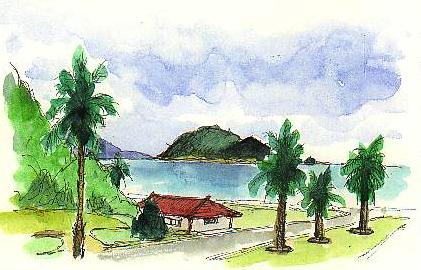 宿の窓からの景色を描く海を正面にした部屋もあるのだが我々の部屋から海は斜め安い料金だから止む無しかヤシの樹があり南国の感じいっぱいだお気に召しましたら人気blog投票をクリックして下さい
