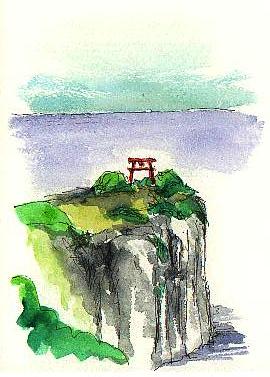 島へのフェリーから見た鳥居越しの神社の姿です生憎鳥居に掛けてある額を修理しているようで足場が組まれていて邪魔でした近くに寄って見ることは出来ませんでしたががっしりと四方に足を張った重厚な鳥居でしたスケッチでは画ききれていませんが 2本の主柱よりもそれを支える短い柱の力強さが印象に残った1トンもあるそれが浜辺に置いてあるのですね流されない力を持っているのでしょうお気に召しましたら人気blog投票をクリックして下さい