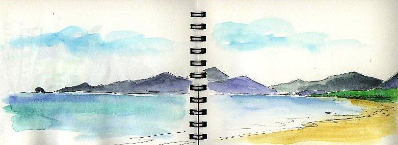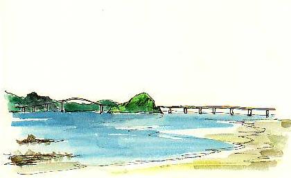 橋を渡る前に海岸に下りて横から眺める先ず水の色に感激 真っ青それに白い砂目を上げると水平線の上に右から左へ橋が横切る中央の橋げたが高くなる変化が単調さを消していると思いながらのスケッチでしたお気に召しましたら人気blog投票をクリックして下さい