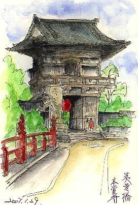 ふらっと鎌倉を散策する鎌倉七福神の一つである本覚寺に足を運ぶ境内に夷堂がある梅の木もあり既に花が芽吹いており中に鶯の姿も目にしたスケッチは山門前を流れる滑川に架かる夷堂橋の袂から描いてみたお気に召しましたら人気blog投票をクリックして下さい