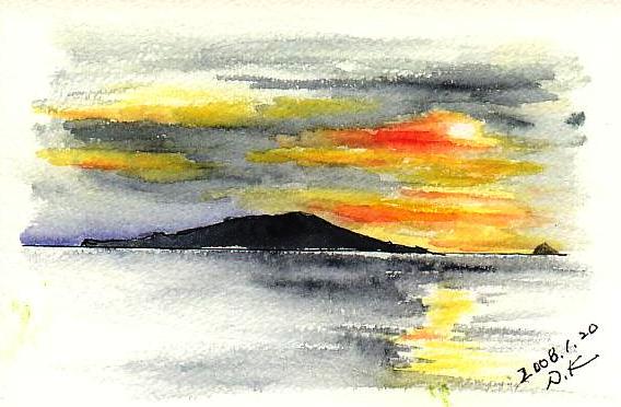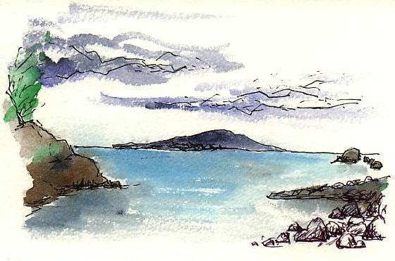 伊豆半島東海岸より大島を望む本当はもっと離れているが 右側に利島、新島、式根島 ・・ と連なっているのが見えるこのスケッチは日の出間もない頃海も空の雲を綺麗だお気に召しましたら人気blog投票をクリックして下さい