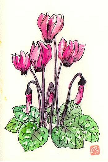 花の少ない時期には貴重です白のシクラメンも咲いてますが スケッチしたのは色をつけられる赤にしました何回か描いてますが 今回は葉に入ってる斑に注意してみましたお気に召しましたら人気blog投票をクリックして下さい