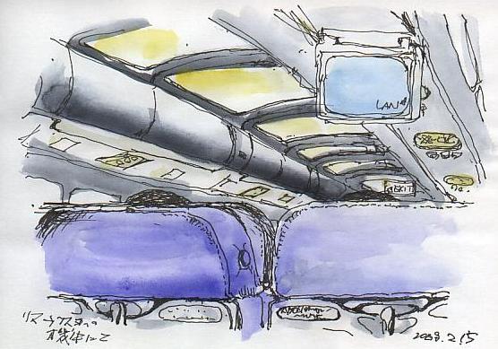 ペルーではLAN航空を使用同じグループ内でダブルブッキングがあったりしたが長い空の旅が続く地球の反対側はホントに遠いことを実感退屈しのぎに機内をスケッチお気に召しましたら人気blog投票をクリックして下さい