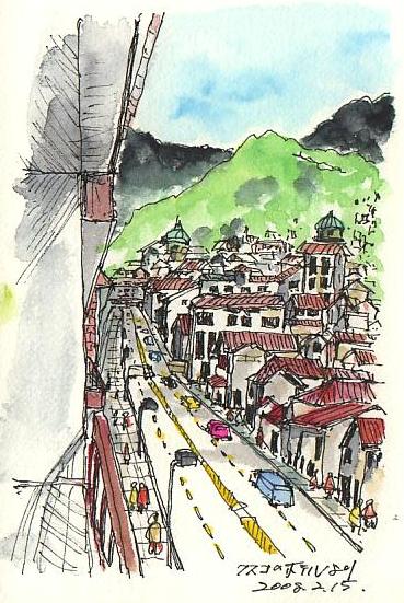 リマからクスコに移動する標高3400mの高地である添乗員から「歩き回らないで身体を休めるよう」にと言われていたのに市内を見学に出掛けてしまったこれが のちのちの命取りに・・・・まだ元気だったときにホテルのベランダからのスケッチお気に召しましたら人気blog投票をクリックして下さい