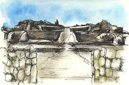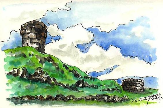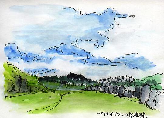 堅固な城壁を持つ要塞はクスコの街が一望できる場所にあるここサクサイワマン遺跡には長くジグザグの壁が続くスケッチは広場を城壁と取り囲む丘を描いたもの広々とした綺麗な広場の散策は気持ちよく大の字になって夏空に浮かぶ雲を眺めていたくなったお気に召しましたら人気blog投票をクリックして下さい