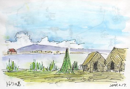 ペルー南部 ボリビアとの国境を跨ぐティティカカ湖面積は琵琶湖の12倍標高は3890米で 船が航行する湖としては世界最高地と習った記憶がある その湖に「浮き島」があるというトトラと呼ぶ葦を3米も積み重ねてそこに家を建て畑をつくりスポーツをするまるで普通の島のように生活している人々がいる少し身体に揺れを感じながらウロス島の家屋をスケッチしたお気に召しましたら人気blog投票をクリックして下さい