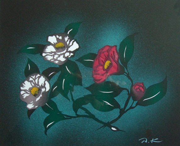 切り絵として完成させた2本の椿額に入れて贈り物とする定年で退職する会社へのせめてもの感謝の気持ちであるお気に召しましたら人気blog投票をクリックして下さい