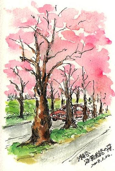 相模鉄道の瀬谷駅から通称「横須賀海軍資材集結所」まで爆弾や火薬類を運搬する専用線が引かれていたそうです。線路に並走する形で海軍道路が真っ直ぐ北上していましたが、現在は撤去した線路を含む道路が桜の名所になっています。車道は桜のトンネルで素晴らしいのですが 歩道に伸びる枝がすべて切られており少し興醒めでした。スケッチでは画面いっぱいに広げてあげていますお気に召しましたら人気blog投票をクリックして下さい