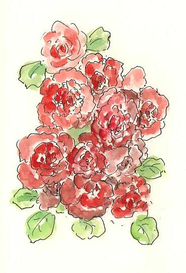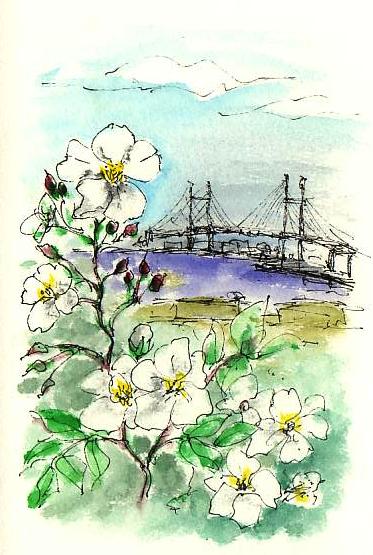 公園から文字通り港が見える、ベイブリッジも見えるその丘は今バラが盛りに咲いているその中でこんな花にも出合った梅もどき?と教えて呉れた人がいたが・・・まあ 名前は知らぬが港に似合いのスケッチになったお気に召しましたら人気blog投票をクリックして下さい