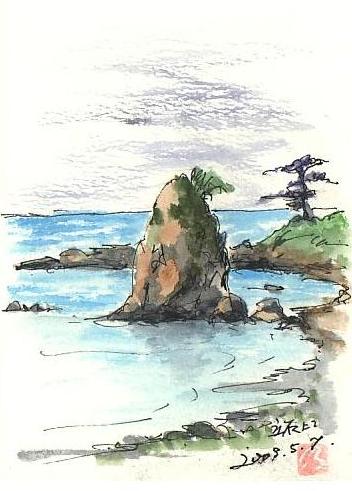 134号線を海を右手に南下、秋谷(あきや)海岸に立つ高さ約12mの岩。これが立石。この日は少し霞がかかっていて富士山は見えず夕景も美しい神奈川の景勝50選の一つ今度は富士か夕焼けを描きたいお気に召しましたら人気blog投票をクリックして下さい