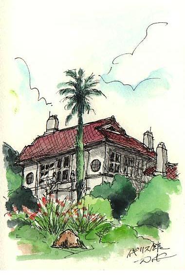 港の見える丘公園に「あかいくつ」号というバスに乗って行く終点で降りるとすぐそばのイギリス館昭和12年の築とのことその英国総領事の公邸を下から見上げたアングルでスケッチする実際にはもっと横に長いが紙面にあわせて縮小したお気に召しましたら人気blog投票をクリックして下さい