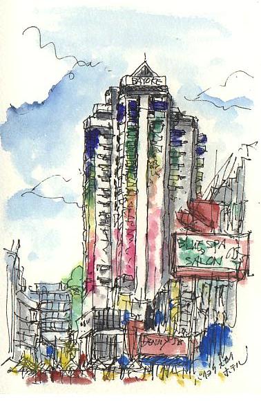 バンコク最初の高層ホテル「バイヨク・スイート」外壁が虹のように色づけされていて大変カラフルですしかし今や周辺にはさらに高層のホテルができ目立たなくなってしまいました入り口付近の道はTシャツ・スカートなどの衣類を売る屋台というか出店でいっぱいでした庶民の活気は健在ですお気に召しましたら人気blog投票をクリックして下さい