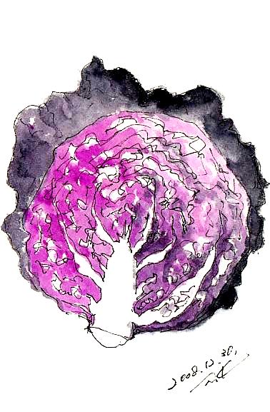 紫色したキャベツを半分にしたら綺麗な模様が出てきたとたんこスケッチしたくなったこのあと切り刻まれてサラダにされ我が胃袋へとなる訳だが自然のデザインに感動であるお気に召しましたら人気blog投票をクリックして下さい