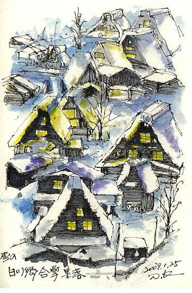 このスケッチもご存知の方も多いと思います白川郷合掌造りです明かりが点くと更にいいですね実は私自身、こんな雪景色も夜景も見たことはありませんお気に召しましたら人気blog投票をクリックして下さい