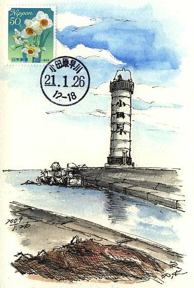 小田原・早川港の入り口を案内する赤と白の灯台がある小田原らしく「提灯」である手前の岸には網が干されているシーンをスケッチした最寄の郵便局には生憎風景印がなかったお気に召しましたら人気blog投票をクリックして下さい
