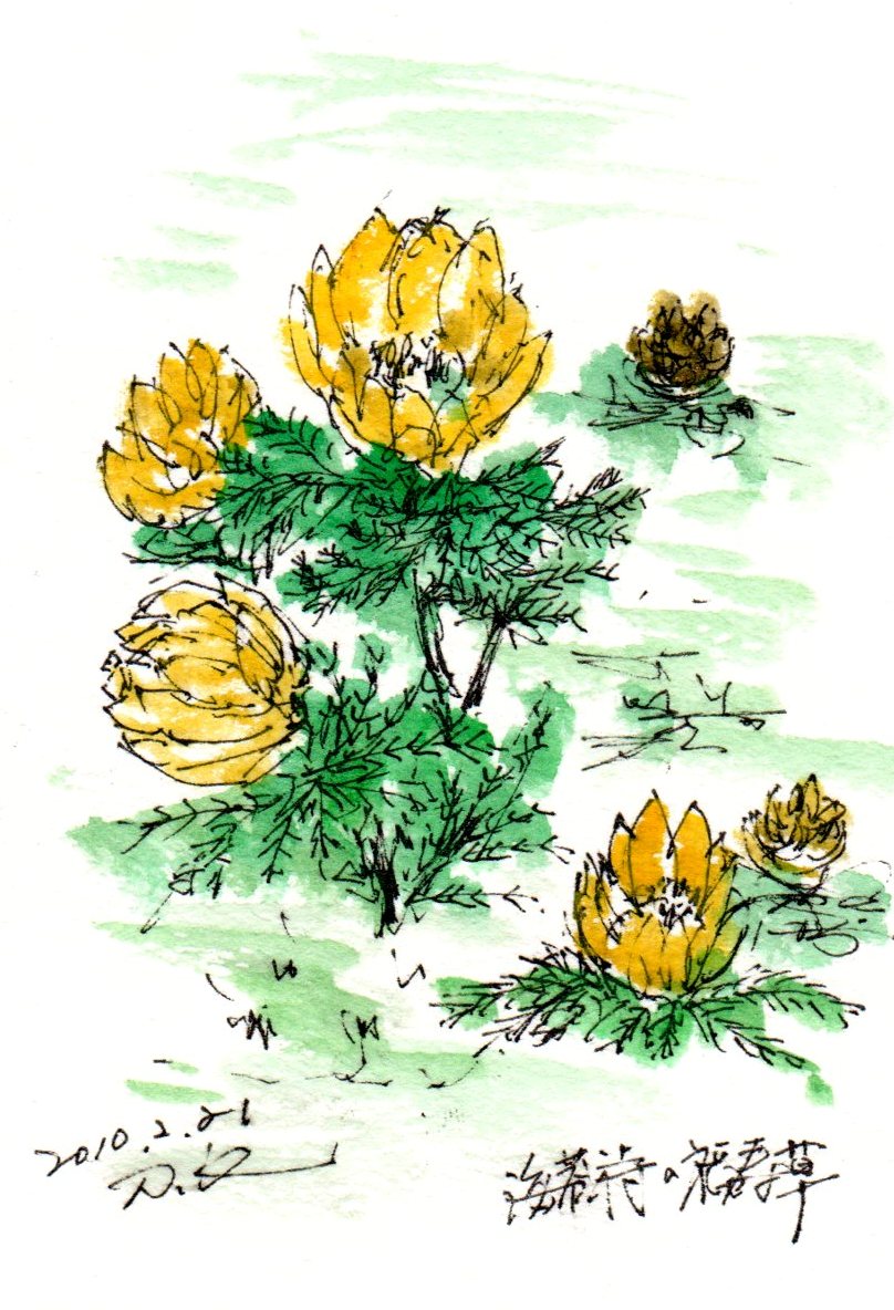 海蔵寺の庭はいつでも花がいっぱいこの時期は「梅」が誇らしげに香りを撒いていた足元に目をやると黄花が見上げている凛々しく一株で また群れをなす輝く緑の絨毯に咲く福寿草をスケッチしたお気に召しましたら人気blog投票をクリックして下さい