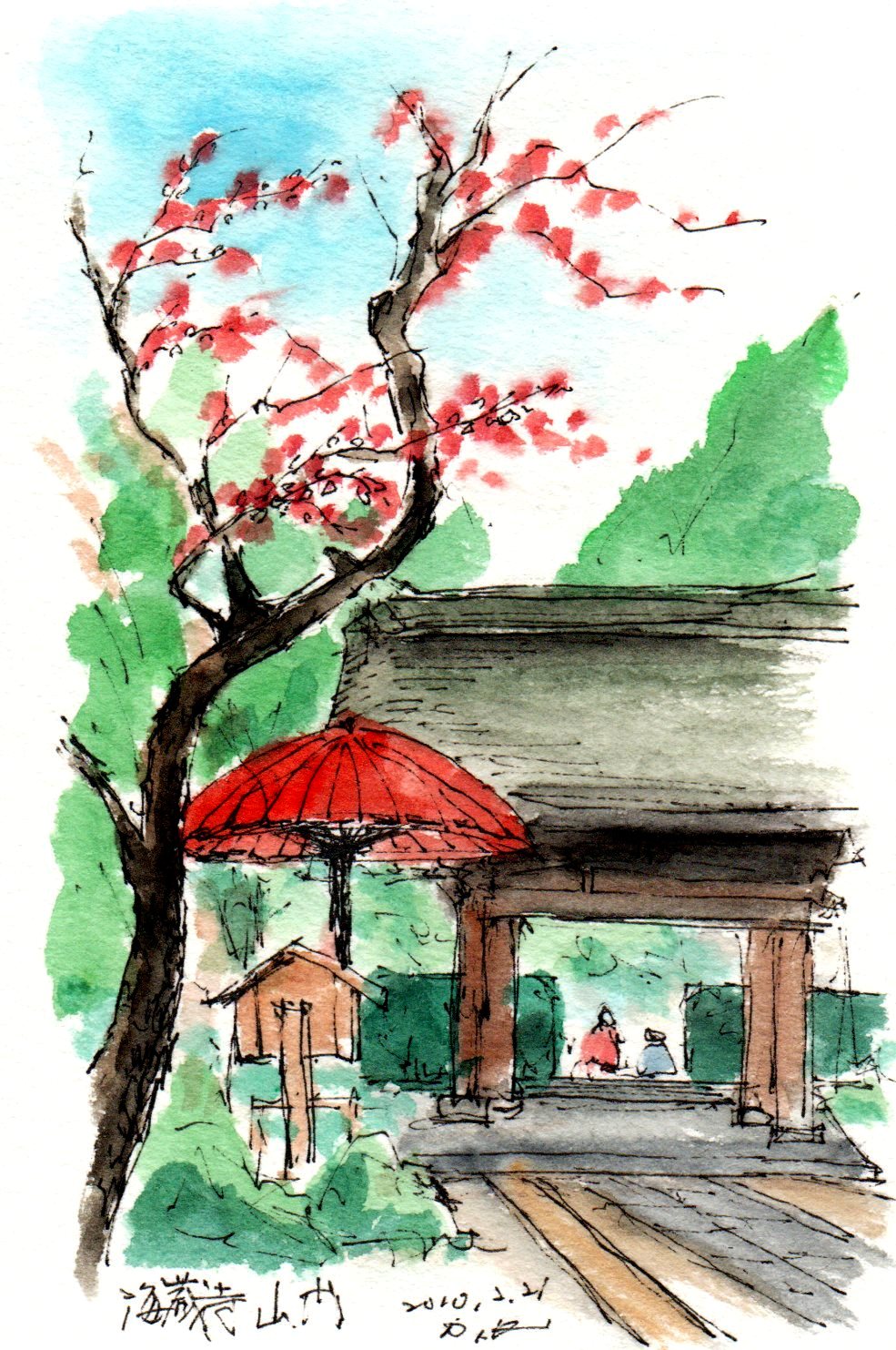 境内に入って本堂前から振り向くと赤い傘が目立つ紅梅越しに山門をスケッチするお気に召しましたら人気blog投票をクリックして下さい