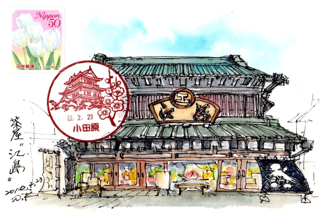 駅前の商店街のなかほどに昔ながらの店構えである店は御茶屋さんの「江島」小田原局の風景印をもらった葉書にスケッチしてみたお気に召しましたら人気blog投票をクリックして下さい