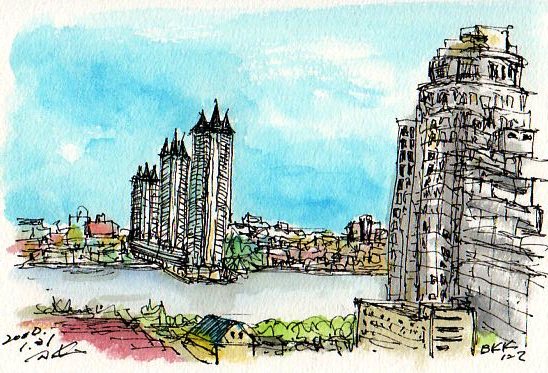 バンコクに行く機会がありまして・・・高くもないホテルだったのに窓から川が見えたんです食後に少し時間が出来たので描きました川を挟んでの高層アパート群お気に召しましたら人気blog投票をクリックして下さい
