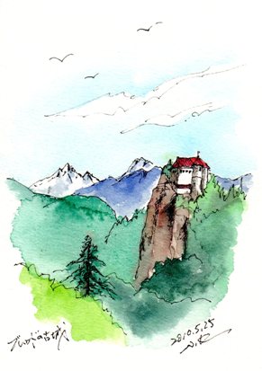 宿泊したホテルから臨む古城は高さ130mの崖の上に建つスロベニア最古の城奥に冠雪するアルプスの東端が見える今日登城する予定だが朝飯前にベランダでスケッチするお気に召しましたら人気blog投票をクリックして下さい