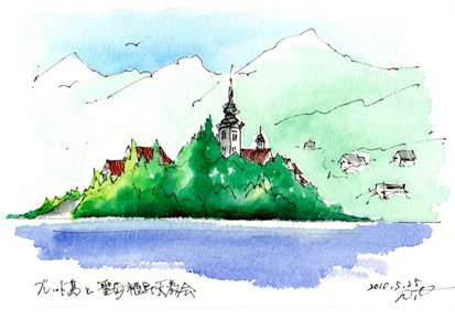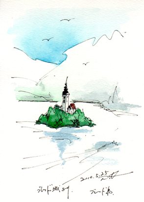 湖に浮かぶ孤島をスケッチする島には手漕ぎのボート(プレトナ)で渡ります限られた人達しか漕ぐことが許されていないそうだお気に召しましたら人気blog投票をクリックして下さい