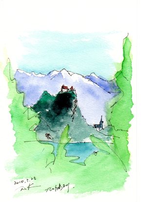 湖畔にそそり立つ城に上り湖を見下ろすと中心に島が浮かぶ海岸線がほんの僅かのスロベニアにあるたった一つの島すばやくスケッチしたお気に召しましたら人気blog投票をクリックして下さい