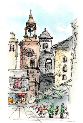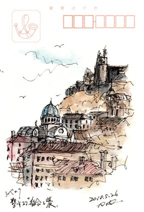 アドリア海に面した街 海岸から続く斜面に古めかしい教会が幾つもあるスケッチは聖ヤコブ大聖堂と高台に建つ聖ミカエル要塞そこからは絶景がひろがるお気に召しましたら人気blog投票をクリックして下さい
