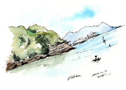 逗子マリーナの一角から小坪湾を抱く岬大崎公園を持つ高台をスケッチした湾は小坪漁港で新鮮な魚貝類を食べさせてくれる店が幾つかあるお昼時には行列もできるほどの人気だお気に召しましたら人気blog投票をクリックして下さい