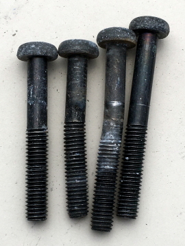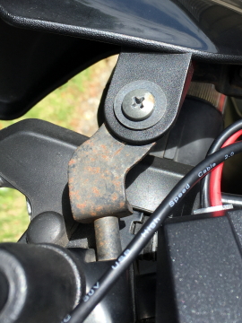 納車された時から気になっていたナックルガードのマントステーの錆。乗車位置からの視線に入る場所なので気になってました。染めQが残っているので錆びを落として塗り直してみます。 構造がわからないので確認。上下、サイド、いろんな方向からビスが使われています。ウィンカーもぶら下がっています。5本のビスが確認できます。裏もしっかり錆びてます。 上下からビス2本外すとナックルガードが外れました。 残るビスは3本。1本はウィンカーがぶら下がってます。2本がこのステーの固定用。どうもスイッチハウジングの固定を兼ねているようです。 向かって右側、車両左側のビスを緩めていくと、なんか感触が変。くるくるっと回りません。んー・・・、グリ、ん-・・・、グリ、って感じです。ネジ山がつぶれているような嫌な感触。 反対側は特にそんな感じはなくて、普通でした。なんだろう。 左右のナックルガードステーが外れました。この車両は左側に転倒傷があります。左のウィンカーが曲がってる気がするので、てっきりこのステーが変形してるのかな、って思ってました。 ぱっと見、差はわからないけど、左が少し開いてるかぁ?微妙です。 だけど、ビスを抜いてみたら、 転倒傷がある、左の取り付けビスが曲がってます。どんだけ衝撃が加わったんだ、って感じです。 ビスは買い直すにして、まずはステーの錆取りをします。錆取り剤を規定通り薄めて漬け込みます。 お、そうだ、ナックルガードの締め付け用のカラー、スリーブも錆びてるかもだから漬け込もう。 小さなカラーを4つ入れたら、 うぉっ!シュワシュワーっと泡が。 さぞステーの錆が落ちたんだろう、と思ったらそんなこともなくて。金属ブラシでゴシゴシしてやっと錆が消えていく感じです。 泡の原因は、これか。なんということ。ほとんど錆びてなかったカラーが地金色に。これもぬり直ししないとダメになりました。 今日はここまで。乾燥したら黒く塗り直して化粧直しです。それにしても、バラさなかったら多分ずーっと気づきませんでした。予想の斜め上を行く破損。いろいろ起こるんだな、勉強になりました。