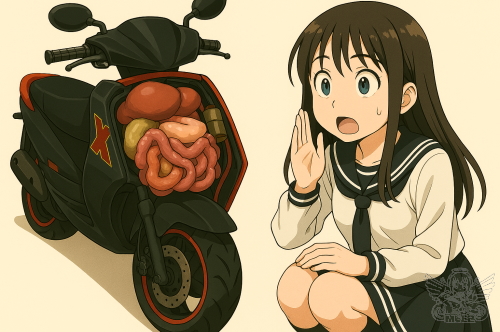 ほんと、いろんな倫理コードに引っかかるんじゃないかと思ったテーマの生成AI画像。なんとかひっかかることなくCopilotさんが描いてくれた秀作。 グロい、グロすぎ。 今回採用したのはこのイラスト。いい感じで女の子が驚いてくれてます。 これはこれでナイス。 すごいな、スクーターの見せ見せ攻撃。破廉恥すぎでは。 驚いてくれてる表情もいいんだけど、グロくて吐きそうになってるイラストもオーダーしてました。 それがこれ。 これもいいな。 嘔吐く感じをお願いしたら仕上げてくれました。ただ残念、女の子のスカートに白線がなかったな。 それが不採用の理由のひとつだけど、なんか、作中といってもとんでもないシーンを女の子に味わらせてる罪悪感があってひっこめました。いや、ほんと可哀そう。泣いちゃう。心が痛みます。 いや、これバイクブログですよね!?って世界です。 一応、バイクブログです・・・。