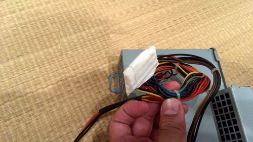 どこをジャンパーすればいいかわかりました。本当はそのジャンパー線の間にスイッチを介して電源のオンオフにしたかったんですが、手元にメスコネクターが現状ないので、ジャンパーもスイッチも自作できません。とりあえずジャンパー線をハンダ付け等もしてませんが、抜け止めとしてテープで止めておきました。