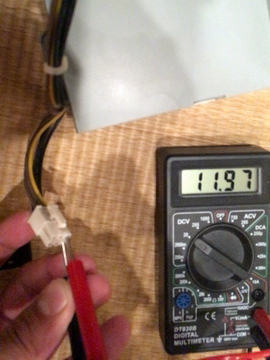 電源の取り出しを考えているPCI-E用と思われ6品コネクターの端子間の電圧を測定します。ちゃんと12V近くでています。多分、このPCI-E用は7.5Aまで出力がありそうなので、カーオーディオくらいは駆動できると思います。