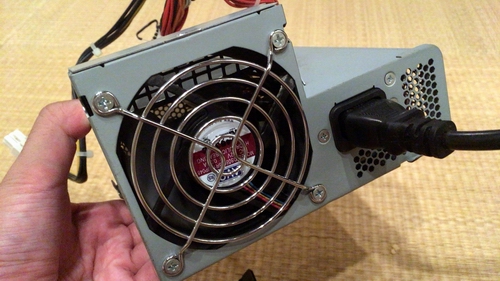 どのみちジャンクの電源なので、分解してファンを交換してみるのもありかも。フルパワーで使うことはないと思うので緩い送風でも十分では、と勝手に思います。