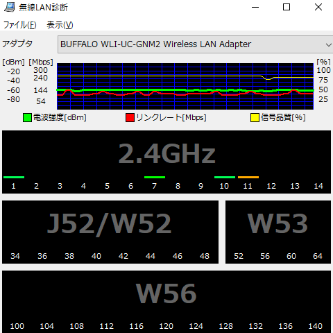 あとで、今回バッファロー子機と一緒に導入したツールをみていたら、診断アイコンがあって、押してみたら下のような結果でした。なんの説明もないけど、出てきている数字からして、帯域内のチャンネルを示しているようです。