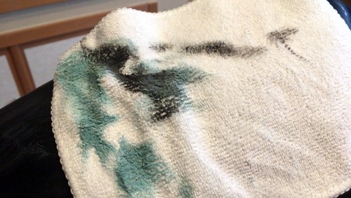 各所このコンパウンドで磨いていきますが、急に抵抗が大きくなりました。なんというか、テープの残った糊をこすっているような抵抗感?嫌な予感・・・。ウェスを見ると真っ黒!