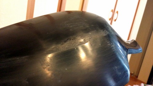 あらー、やっぱりクリア層を破って塗膜を削りに入っています。ペーパー、掛け過ぎた?この段差は磨けば磨くほど広がっていきます。上塗りしたブラックを全部は剥ぐまで消えません。それか、もう一度塗り直せばいいけど・・・。