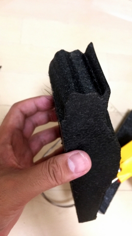 電熱線で溶かして切るんですが、発泡スチロールくらいだと楽々切れます。型紙を押し当てて、発泡ストロールになぞり線をつけます。それに沿ってカット。うまく切り出せました。