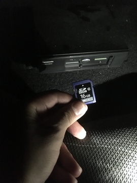 まずは購入を済ませて、クルマに行って地図情報が入っているSDカードを回収します。助手席下にナビ本体があります。地図用のSDカードが入っているスロットはカバーで保護されています。
