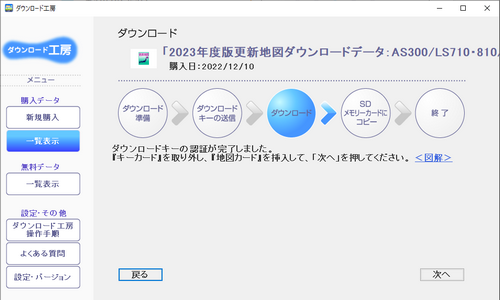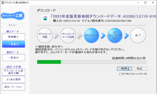 で、先日ナビ本体から読み込んで置いたダウンロードキーを認証させて、ダウンロード開始です。