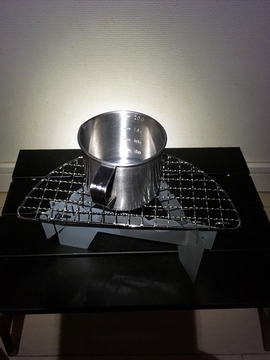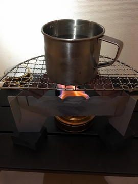 実際に五徳の上にカップを置いてみると。案の定、ぎりぎり。ちょっと置く位置を間違えたら崩れます。火のついたアルコールに水が入って、流れ出るなんて炎の流出、インシデントです。