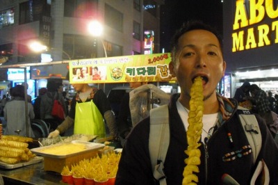 二日目の朝がやってきました。街からは少し離れた汝矣島(ヨイド)のホテルで1泊をした二人は、朝ホテルから駅まで徒歩で向かい、電車で安国(アングク)の駅を目指しました。安国にある観光スポットの北村(プクチョン)では伝統的韓屋が並ぶ眺めを堪能できる人気の観光スポットで、最近では冬のソナタの撮影スポットにもなっていたそうです。北村(プクチョン)冬のソナタの撮影スポット。でも見たことが無いので分からなかったです。(^^;) 昼まで北村をのんびり散歩をした後は、電車で南大門へ移動して昼食をとることにしました。南大門は沢山の食堂や服屋が並んでて凄く賑わっていてます。さぁ昼食は何処にしようかなぁ~。迷いに迷ってぶらぶらしていると、大好物の豚足屋さんを発見!二人は迷わず店に入り、豚足をビールを注文しました。(^^)おぉ~豚足がきた~。凄いボリュームだ!ではではパクリ。マイウ~(*^ワ^*) 日本にこの店が近所にあれば常連になるの間違いなしですな!腹いっぱいになって、さぁどうしよう。とりあえず南大門をもう少し観光して、昨日の夜に車で降ろしてもらった明洞に向かいますかぁ~なんて言っている矢先にショウちゃんがワッフル屋さんの屋台を見つけちゃいました・・・しかしよく食いますなぁ~(;゜0゜) じゃ~そろそろ次に向かうために駅に戻って電車で明洞まで移動しよう。明洞に到着して歩いていると、公園でなにやら騒動が。パトカーやら消防車やら何台も停まってて地面には怪しげな箱が置いてありました。開けるのかなって10分くらい野次馬をしてたけど、暫らくは箱を開ける気配が無かったのでここからは離れて、フラフラとショッピングでもしながら歩いていると、ドーナツ屋さんがあって・・・しかしよく食いますなぁ~(;゜0゜) 明洞ではショッピングとアカスリを予定してたんだけど、ガイドブックに載っていた東大門にある銭湯が気になっていたので、アカスリは東大門にある銭湯でやることになりました。そろそろ夕方だし、昨日も行った夜の街東大門に電車で移動することに。1時間くらい迷って、やっとの思いで銭湯を発見した2人は数種類のサウナに入って本場のアカスリをやってもらい、いっぱい汗を流した後は、今夜も東大門で夕食&飲みをすることにしました。そしてやってきた一軒目!風呂上りのビールはやっぱり旨い(^^)今夜もやっぱり豚カルビを注文!おぉ~やっぱりマイウ~(*^ワ^*) 次は韓国の人が色々な店で飲んでるのをよく見かける焼酎を注文してみました。こっちでは割り物が無くてジンロをストレートで飲む感じなんです。どれどれゴクリ。あぁ~効きますなぁ~_(・_・ )ちょっとこれを飲み干すのは無理だぁ~。ちょっと店を移動しよう。本場韓国のプルコギってどんなだろう。次の店ではビールとプルコギを注文。あれ?プルコギってスープなの?旨いけど日本のピザとかにのってるプルコギと違うんだなぁ。せっかくだから、違う店のプルコギを食べたくなって次に移動してみることに。あっ!俺の好きそうな屋台街がある。何処にしようか迷う前に、屋台のおばちゃんに無理やり腕を引っ張られて屋台に入ることに(^^)とりあえずビールとプルコギを注文!お通しのおでんが先に出てきました。ちょっとすると、お目当てのプルコギも!ではではパク。日本のピザにのっているのとは味と食感は違うけどマイウ~(*^ワ^*) せっかく大好きな屋台街だし、もう一軒行ってみたくなって、他の屋台に移動してみました。この店ではお通しのおでんが先に出てきて、ビールと焼き鳥とチヂミを注文!やっぱり日本で焼き鳥屋さんをやってるからには世界の焼き鳥も味わってみないとな(^^)料理がきました。あれっ?焼き鳥?さっきの屋台で食べたプルコギみたいだぞ・・・ではパクリ。うんマイウ~(*^ワ^*) 見た目は似てたけど、さっきのプルコギとは味は違ってました。それにしても食ったなぁ~。あらら・・・知らない間に時計も深夜の2時頃になってて、電車も終電で走ってないな。今夜はタクシーに乗って帰るか。タクシータクシー、あれ?ロッテリア!帰ってホテルで食べよう。タクシーに乗る前に、ロッテリアのセットとコンビニで酒を買ってホテルで軽く飲んで寝ました。世界の旅をしたくなっての第一歩で韓国に来たけど、本当に楽しくて思い出の残る2泊3日になりました。世界中の色々な所に行きたい。世界中を肌で感じたい。言葉は通じないけど世界中の人達と笑顔で通じたい。今は短い休みで近場を旅する事しか出来ないけど、これから半年、1年かけて世界を1周する気持ちを持ちながら、これからも頑張らないとな(^^) ↑ポチっと1押しお願いします↑