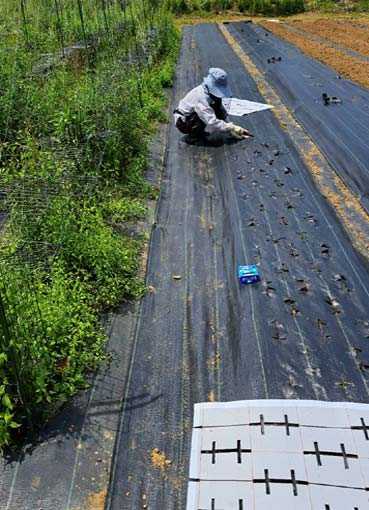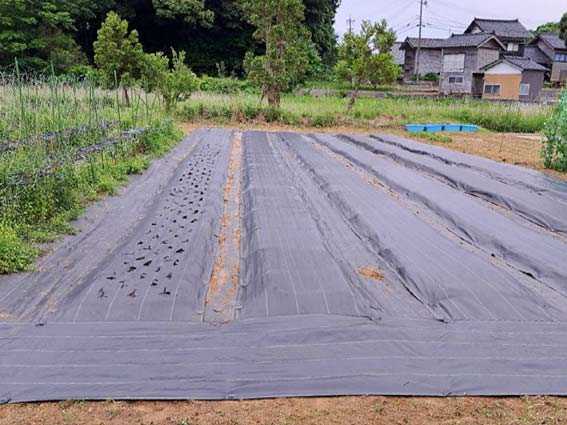 6畝のシート掛けと苗植えの位置を切っていく(左の切り目)・・・腰痛!